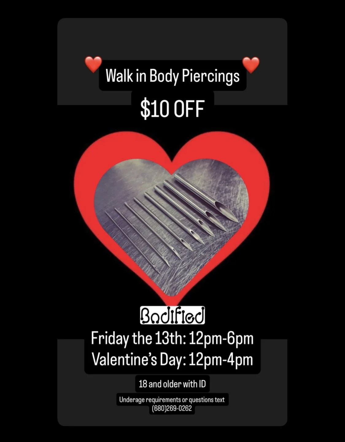Text (680)269-0262 to schedule a body piercing with Heidi. 18 and older with ID. Underage requires parent with ID and child’s birth certificate. Text for more information.